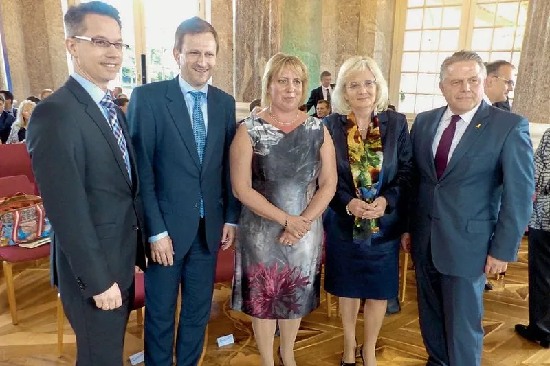 Geschäftsführerin Antje Reichert (Mitte) konnte zahlreiche Gäste aus Wirtschaft und Politik begrüßen, darunter (v.li.) Dr. Christian Gastl, Präsident der IHK Wiesbaden, Stadtrat Dr. Oliver Franz, Petra Müller-Klepper, Landtagsabgeordnete und Klaus-Peter Willsch, Bundestagsabgeordneter.