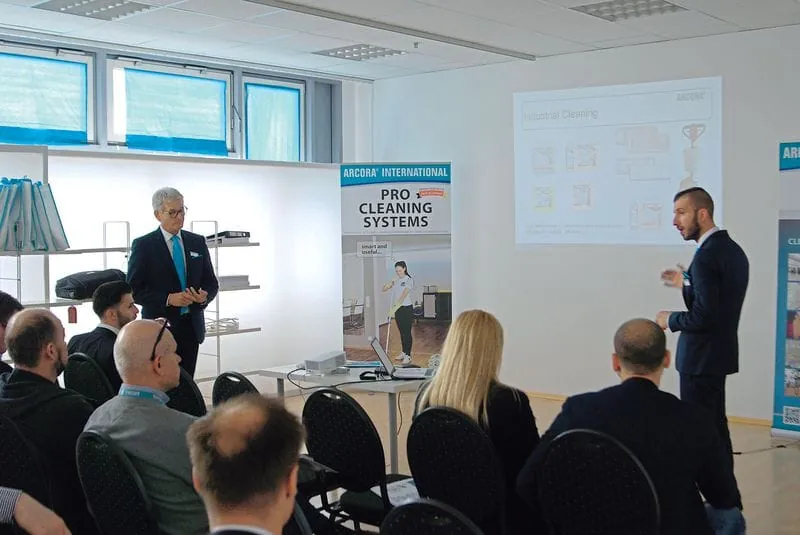 Firmengründer und CEO Sami Memili blickte in einem kurzen Vortrag auf die Geschichte des Unternehmens zurück und zeichnete die Entwicklung vom lokalen Händler zu einer international agierenden Gruppe nach. Alles begann nach dem Studium in den USA 1992 mit der Gründung der Arcora Handels GmbH in München. Zu den weiteren Meilensteinen der Firmengeschichte zählen die Einführung der ersten Eigenmarken (1994), die Gründung der Arcora International GmbH (2005) und der Umzug an den heutigen Hauptsitz in Aschheim bei München (2011). Heute ist Arcora in 29 Ländern, davon 18 in Europa, international vertreten. Getreu dem Motto „Alles aus einer Hand“ stützt sich der Erfolg der Unternehmensgruppe auf die Herstellung von Reinigungschemie, -textilien, -maschinen und -zubehör. Zu den bekannten Marken zählen zum Beispiel Ecomop Reinigungstechnik, XLine Cleaning Systems (Komplettsystem), GastroLine (Gastronomie- und Hotelbedarf), Archem Chemicals (Fußbodenbeschichtungen), Arcotex (Mikrofasersysteme), ArTech Reinigungsmaschinen, Artex (Berufsbekleidung), Arpad (Reinigungs- und Polierpads), Arcora Chemie (Reinigungs- und Pflegemittel).