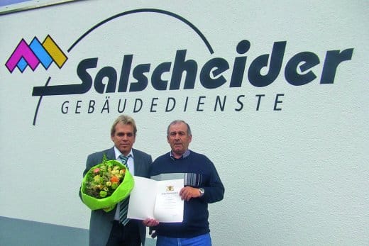 Nun ist Zissis Deligianidis in den Ruhestand getreten. Günther Salscheider überreichte ihm einen Blumenstrauß und ein Geschenk. Für seinen unermüdlichen Einsatz wurde Zissis Deligianidis außerdem mit der Ehrenurkunde des Landes Baden-Württemberg sowie mit der Ehrenurkunde der Handwerkskammer und der Landesinnung für Gebäudereiniger ausgezeichnet.