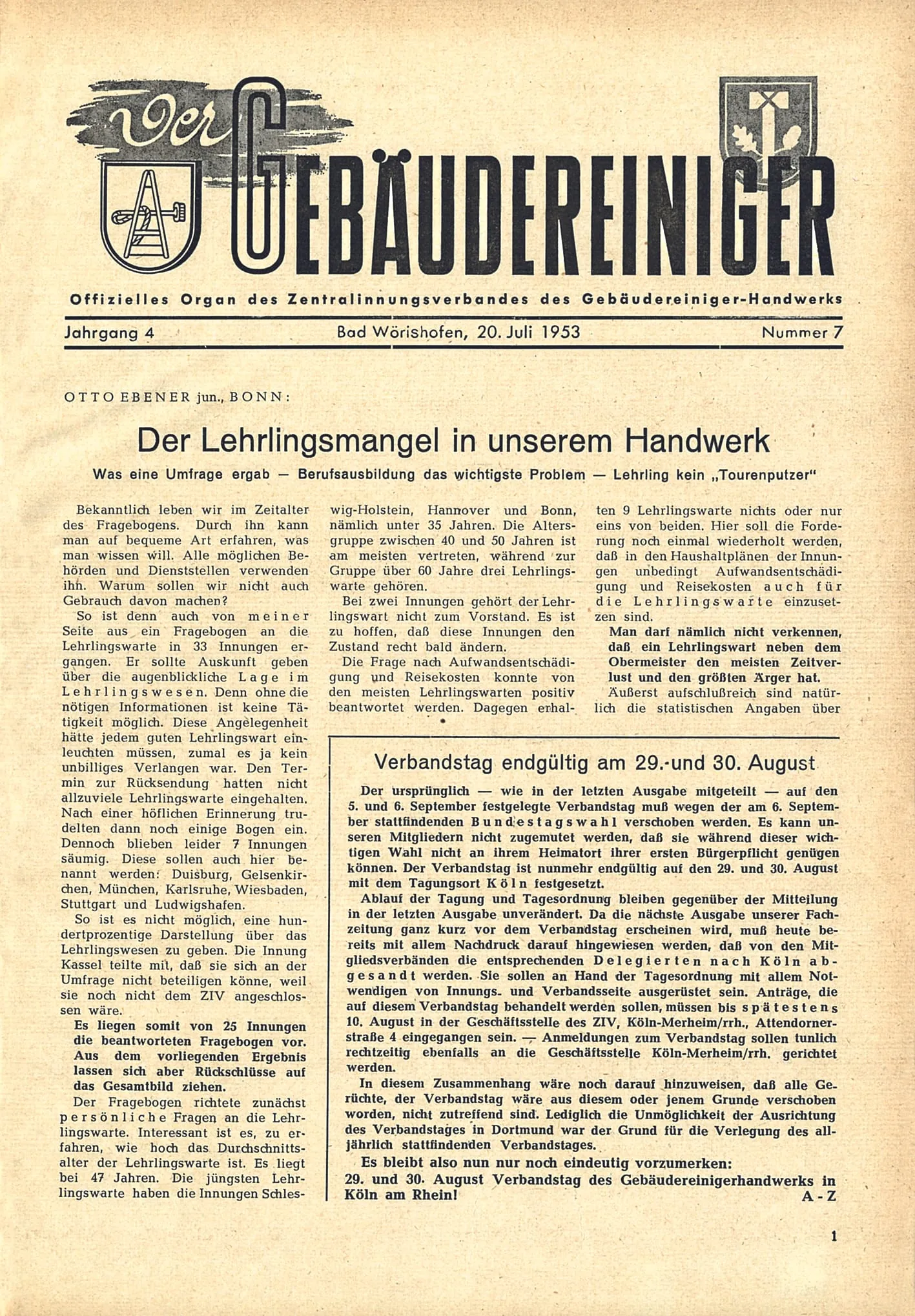 Name und Struktur der Zeitschrift ändern sich in den folgenden Jahren mehrmals. Aus "Der Glas- und Gebäudereiniger" wird im Zuge der Namensänderung des Zentralinnungsverbandes zunächst "Der Gebäudereiniger. Offizielles Organ des Zentralinnungsverbands des Gebäudereiniger-Handwerks". Im Oktober 1953 schlägt sich die Umbenennung des Zentralinnungsverbands in Bundesinnungsverband des Gebäudereiniger-Handwerks (BIV) im Untertitel der Zeitschrift nieder. Nach der zeitweiligen Aufspaltung der Berufsorganisation – in Bundesinnungsverband und Fachverband – erscheint "Der Gebäudereiniger" ab Dezember 1954 als offizielles Organ beider Verbände. Zuständig für Beiträge aus dem Bereich des Bundesinnungsverbands ist Georg Röwer (Hannover), Beiträge aus dem Fachverband verantwortet dessen Präsident Arthur Frommholz (München).