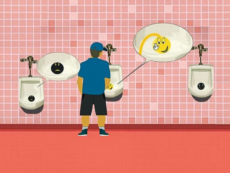 Ein witziges Produkt, das den Reinigungsaufwand in öffentlichen Herrentoiletten reduzieren helfen soll, sind Urinal-Sticker. Der Sticker wird direkt ins Urinal geklebt. Sobald Mann darauf zielt, verändert sich das Motiv des Stickers. Zum Beispiel ist zunächst ein trauriger Smiley zu sehen, in Kontakt mit dem Urin (Wärme) wechselt das Motiv zu einem lachenden Smiley. Das hat den Effekt, dass Mann automatisch auf den Sticker zielt, um den lachenden Smiley zu sehen – und der Urin landet dadurch im, anstatt neben dem Urinal. Es stehen weitere Sticker mit unterschiedlichen Motiven zur Verfügung.