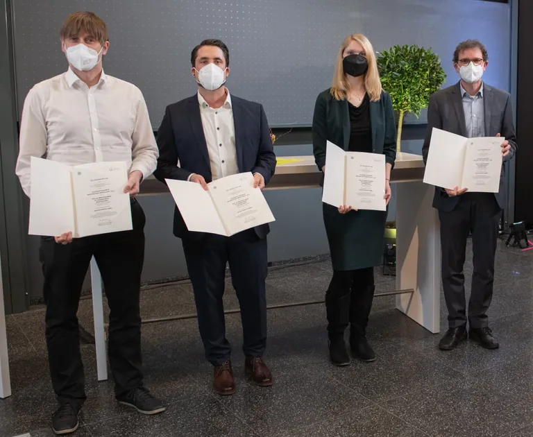 Dr. Siegfried Hochdorfer (li.), technischer Leiter bei Adlatus, nahm den Preis gemeinsam mit Vertretern der Abteilung Human Factors - Dr. Johannes Kraus, Franziska Babel und Professor Martin Baumann (v.li.) - entgegen. - © Adlatus