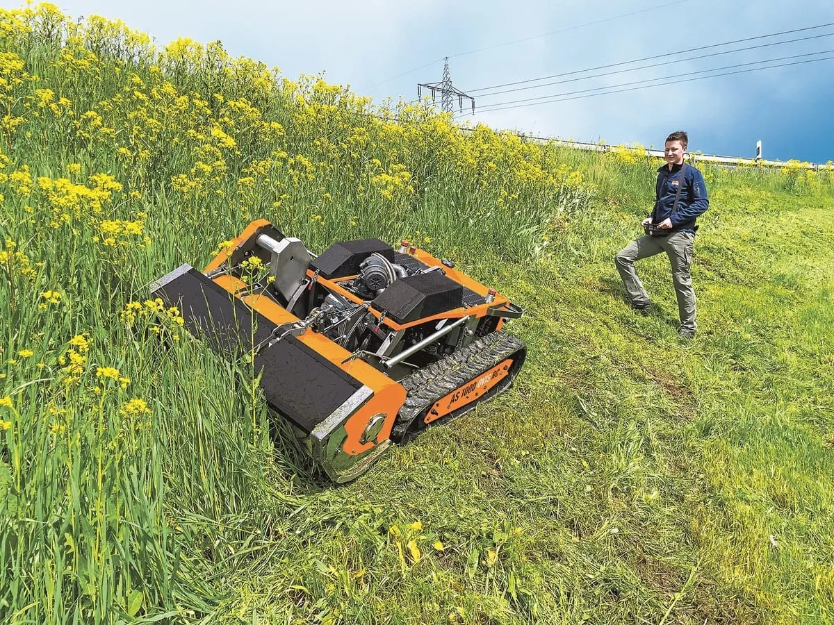 © AS-MotorAS-Motor präsentiert für die Saison 2022 einen neuen Profi-Mäher: Der ferngesteuerte Raupen-Schlegelmäher (AS 1000 Ovis RC) steht nach Unternehmensangaben für höchste Mähleistung und extreme Hangtauglichkeit. Mit einem Vanguard Professional Zwei-Zylinder-Motor mit 23 PS erzielt er mit einer Mähgeschwindigkeit von bis zu fünf Stundenkilometern eine Flächenleistung von bis zu 5.000 Quadratmetern pro Stunde bei gleichzeitig hervorragendem Schnittbild und gleichmäßiger Grasablage über die gesamte Arbeitsbreite. Durch das 100 Zentimeter breite Schlegelmähwerk in Verbindung mit einem etwas schmaleren Raupenlaufwerk ist randnahes Mähen kein Problem. Dank des flexibel einstellbaren Mähdecks kann der neue Schlegelmäher an alle Geländebedingungen angepasst werden. Der ferngesteuerte Hangmäher mit seiner kompakten Bauweise mäht – dank Fernsteuerung aus sicherer Entfernung – auch schwieriges Gelände und schwer zugängliche Flächen. Groß dimensionierte Raupenlaufwerke mit Stahleinlagen sorgen für geringen Bodendruck, ideale Kraftübertragung und Halt an steilen Hängen. -