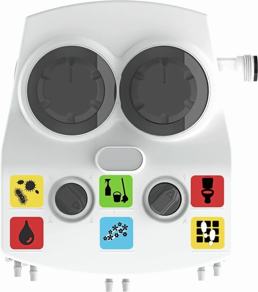 © BrightwellEcomulti 4+2 von Brightwell Dispensers ist ein neues Spendersystem zum Verdünnen und Dosieren von konzentrierten Reinigungschemikalien. Es ermöglicht die Dosierung von bis zu sechs Reinigungskonzentraten von einem Spender. Das System ist mit zwei separaten Venturisystemen ausgestattet, wodurch es sich für die Kombination von Anwendungen für hohe Fließraten (14 Liter/Minute) und niedrige Fließraten (4 Liter/Minute) eignet. Mit dem Gerät können Sprühflaschen, Eimer und Bodenreinigungsmaschinen befüllt werden. Brightwells patentierte Verdünnungstechnologie sorgt für genaue Verdünnungsverhaltnisse und einfache Handhabung. -