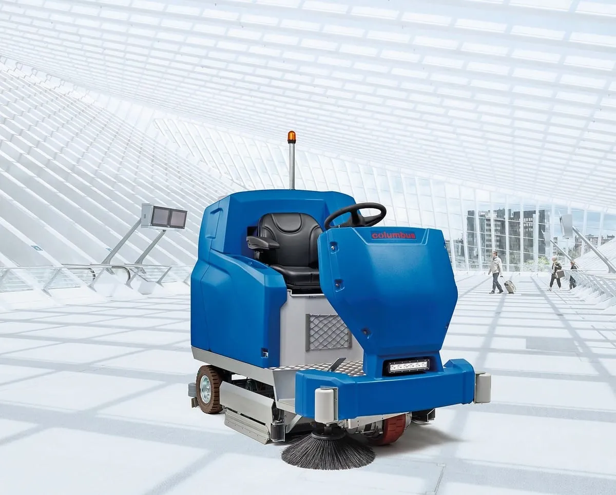 © ColumbusColumbus stellt mit dem neuen ARA 100|BM 200 eine robuste Reinigungsmaschine vor. Mit seinem 200-Liter-Frischwassertank ist der Aufsitzer für nahezu jede Heavy-Duty-Anforderung konfigurierbar: Doppelwalzen- oder Scheibenbürsten, einstellbarer Bürstdruck von bis zu 100 Kilogramm, Allradantrieb für Steigungen bis 20 Prozent, Vorkehrseitenbesen, Wasser- und Chemiedosierung, Sprühlanze und Schutzdach. Der niedrige Einstieg, das intuitiv bedienbare Display, eine gute Übersicht über den Arbeitsbereich sowie der auf den Anwender einstellbare Sitz bieten ein hohes Maß an Komfort. Die Batteriekapazität (320 Ah 5 36 V) macht Einsätze von bis zu acht Stunden möglich. Große Revisionsklappen sowie werkzeuglos wechselbare Deckeldichtungen erleichtern zudem eine hygienische Reinigung und Desinfektion nach HACCP. -