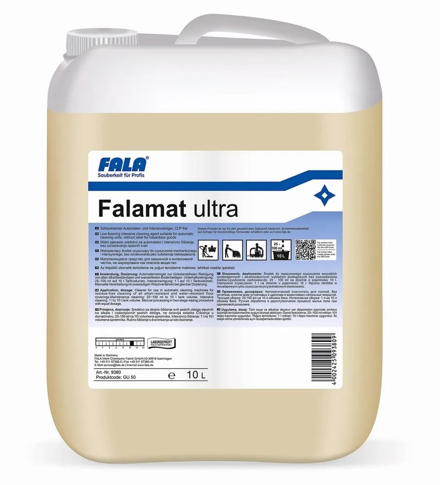 © FalaMit Falamat ultra hat das Fala-Werk einen neuen Automaten- und Industriereiniger mit flexiblen Einsatzmöglichkeiten und hoher Reinigungsleistung entwickelt. Er ermöglicht eine kraftvolle, alkalische Reinigung, die gleichzeitig belagsschonend ist. Die extrem schaumarme Rezeptur reduziert die täglichen Servicezeiten nach Herstellerangaben spürbar. Der Reiniger kann daher unter anderem auf rauen Böden mit dem Scheuersaugautomaten oder der Einscheibenmaschine, aber ebenso auf hochglänzenden Epoxidharzoberflächen eingesetzt werden. Falamat ultra lässt sich sehr variabel dosieren. So kann eine geringe und sparsame Dosierung in der Unterhaltsreinigung mit dem Scheuersaugautomaten oder eine konzentrierte Intensivreinigung mit der Einscheibenmaschine – bis hin zur gezielten Entfernung von diversen Abriebspuren – flexibel eingestellt werden. Trotz der hohen Reinigungsleistung ist bei Falamat ultra keine Gefahrstoff-Kennzeichnung nach der CLP-Verordnung erforderlich. Die dezente Beduftung des Reinigers macht die Verarbeitung angenehm und reduziert die Belastung durch starke chemische Gerüche. -