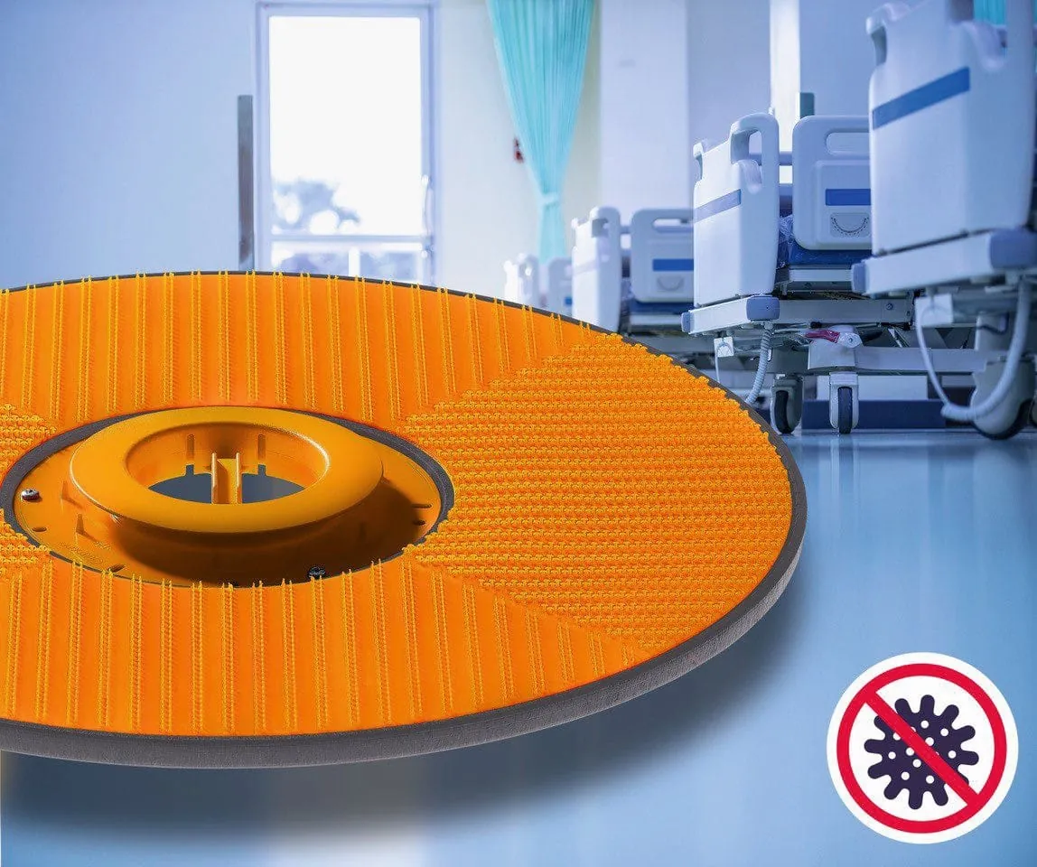 © GutmannBei der Bodenreinigung in Krankenhäusern, Reinräumen, Großküchen und vielen weiteren sensiblen Hygienebereichen ist der Einsatz von Reinigungsmaschinen nicht mehr wegzudenken. Allerdings muss gewährleistet sein, dass durch den Reinigungsprozess keine Keime und Bakterien auf der Fläche und im Gebäude verteilt werden. An diesem Punkt setzt der laut Hersteller weltweit erste Treibteller mit antibakterieller Funktion von Eugen Gutmann an. Das Risiko, Keime und Bakterien bei Maschineneinsätzen in mehrere Räume zu tragen, wird mit dem neuen Treibteller deutlich minimiert. Eine Kontaminierung der Reinigungspads durch am Treibteller festgesetzte Keime und Bakterien ist nach Unternehmensangaben (fast) unmöglich. Eine spezielle Kunststoffmischung ermöglicht in Verbindung mit einem patentierten Laserschweißverfahren höchste Hygienesicherheit und Qualität. Der neue Antibac-Treibteller ist zu 100 Prozent recycelbar und schont damit die Umwelt. -