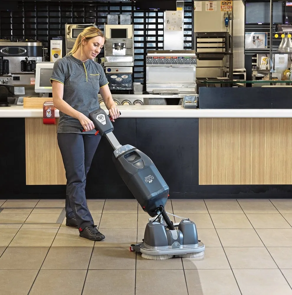 © KärcherMit der Scheuersaugmaschine BR 30/1 hat Kärcher ein Gerät für kleine, beengte Räume auf den Markt gebracht. Es ist mit einer Vorkehrfunktion für Grobschmutz und Haare ausgestattet, was die Reinigungszeit nach Herstellerangaben um bis zu 50 Prozent verkürzt. Zwei sich drehende Walzen (500 beziehungsweise 650 Umdrehungen/Minute) und ein Anpressdruck von 40 Gramm pro Quadratzentimeter bringen gegenüber der manuellen Reinigung ein deutlich besseres Ergebnis. Auch eine Bodendesinfektion ist realisierbar. Die akkubetriebene Maschine mit 30 Zentimetern Arbeitsbreite nimmt die Schmutzflotte (0,7 Liter) automatisch auf. Während Flächen nach der Arbeit mit dem Mopp fünf bis zehn Minuten feucht bleiben, sind sie nach der Reinigung mit der BR 30/1 nach ein bis zwei Minuten trocken. Dank des niedrigen Geräuschpegels von 55 dB(A) ist das Arbeiten in Räumen mit Publikumsverkehr möglich. Die Akkulaufzeit liegt bei einer Stunde, die Ladezeit beträgt 40 Minuten. Mit Akku und leerem Tank wiegt die Maschine 6,1 Kilogramm. -