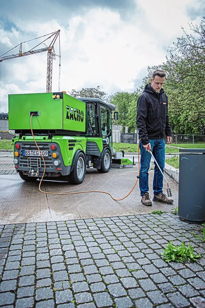 © EmpasIn der Wildkrautbekämpfung mit Heißwasser ist eine gleichbleibend hohe Wassertemperatur der wichtigste Faktor für die Entfernung der Pflanzen. Hier setzt Empas mit seinem Modell MCB 3.0 an: Das integrierte CTWF-System (Constant Temperature Water Flow) reguliert automatisch und rechnergesteuert die Temperatur in Abhängigkeit von der Wasser- und Außentemperatur. So wird im geschlossenen System 102 Grad Celsius und beim Austritt an der Düse eine konstante Wassertemperatur von 99 Grad Celsius gewährleistet. Mit nur wenigen Durchgängen pro Jahr kann das Wildkraut damit effektiv und nachhaltig ohne Chemie entfernt werden. Die MCB 3.0 kann mit einem eigenen Lithium-Akku ausgestattet oder an ein Elektrofahrzeug angeschlossen werden. Aufgrund des modularen Aufbaus sind weitere Ausstattungen und Anpassungen möglich. Ob ein zusätzlicher Tank, eine höhere Pumpenleistung oder ein Doppelbrennerkessel – das Gerät kann an die jeweiligen Bedürfnisse angepasst werden. Mit einer Zusatzdüse kann zudem die Möglichkeit der Hochdruckreinigung genutzt werden. -