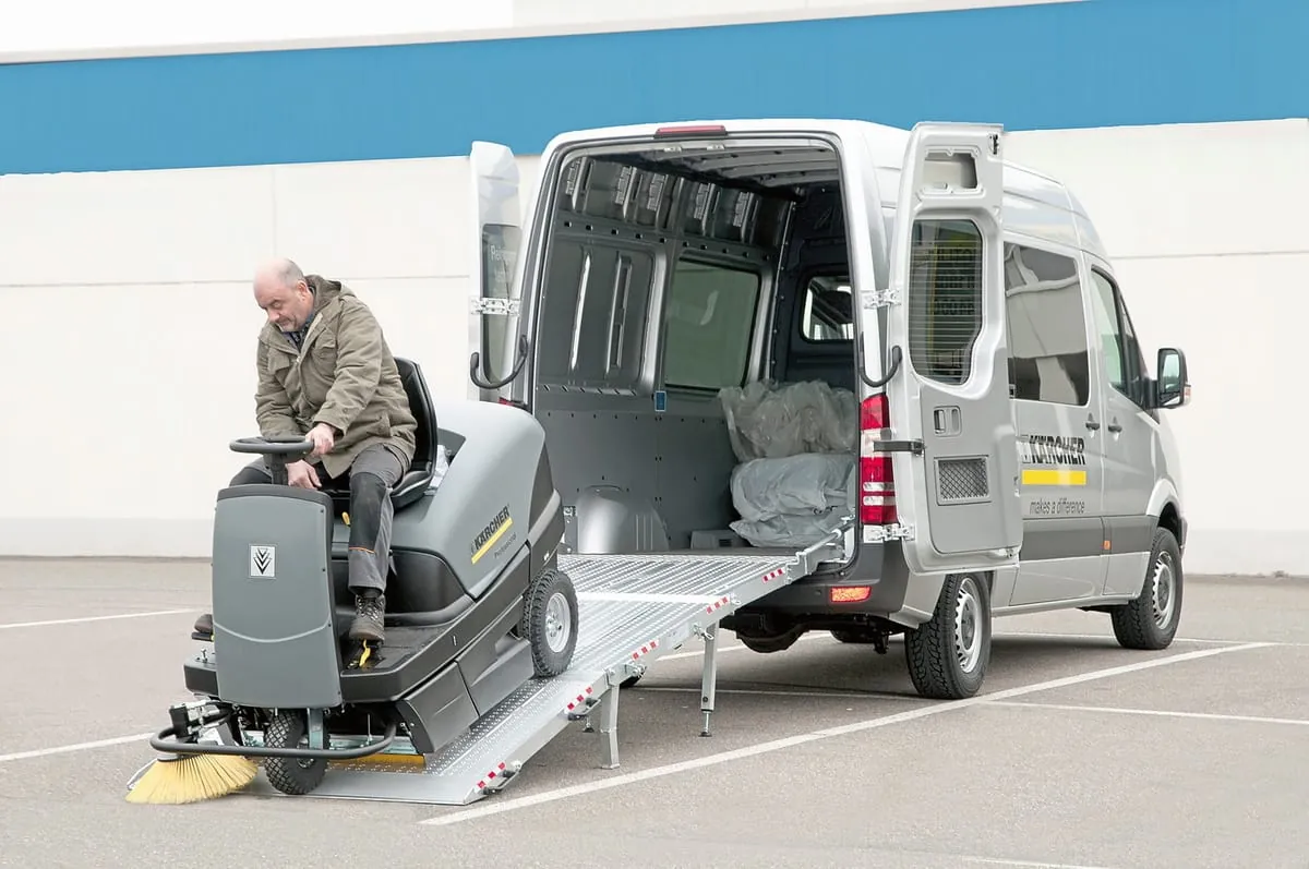 © altecTäglich müssen in Reinigungsfirmen schwere Geräte schnell und sicher bewegt werden. Altec bietet für solche Fälle eine klappbare Aluminium-Verladeschiene. Die fest im Fahrzeug montierte RRK-Z-Rampe bietet eine komfortable Lösung beim häufigen Be- und Entladen durch leichtes Ausklappen mittels Gasdruckfeder. Durch drei Rampenteile kann eine hohe Gesamtlänge der Verladeschiene erzielt werden. Dies ergibt eine sanftere Steigung, die es ermöglicht, auch Reinigungsgeräte mit niedriger Bodenfreiheit zu verladen. Während der Fahrt steht die Rampe in senkrechter Position und wird durch Sicherungen gehalten. Dank integrierter Gummipuffer entstehen keine Klappergeräusche. Die Verladeschiene wird in unterschiedlichen Längen und Breiten sowie mit verschiedener Tragkraft hergestellt. Auch Sonderanfertigungen sind möglich. -