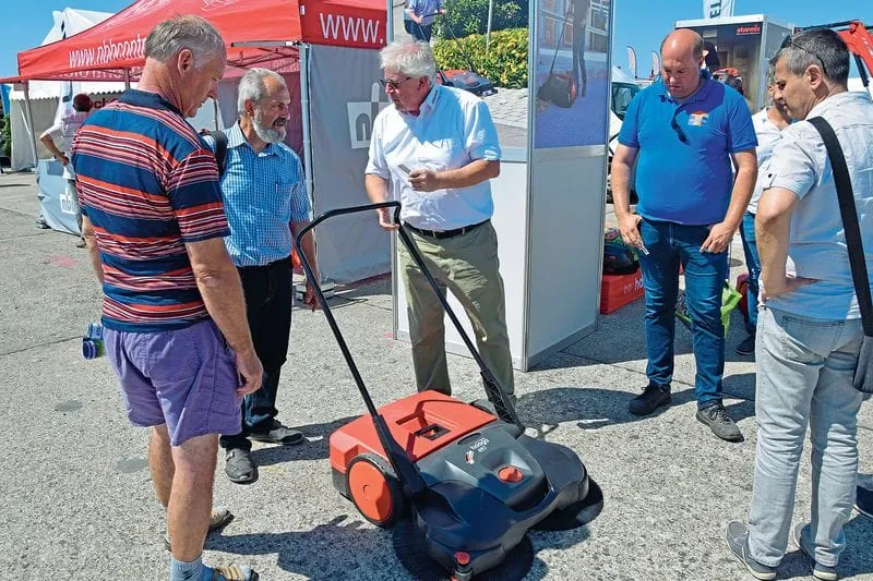 Ebenfalls Silber gewann Westermann mit der kompakten Wildkrautbürste WKB 660 Honda. Anstelle von konventionellen, sich drehenden Bürstentellern mit Metallzöpfen, die auf dem Untergrund Kehrstreifen hinterlassen können, hat sie drei Bürstenteller mit je vier Drahtzöpfen, die sich einzeln drehen und unter einem rotierenden Bürstenteller sitzen. Das schont den Untergrund. Zusätzlich werden die Pflanzen von mehreren Seiten angegriffen. Die langlebigen Drahtzöpfe können einfach nachgestellt oder ausgetauscht werden. Die Wildkrautbürste verfügt zusätzlich über eine Start-Stopp-Automatik, die als sogenannte Totmanneinrichtung funktioniert und verhindert, dass die Bürsten weiterrotieren, wenn niemand den Schalter gedrückt hält. Ein Spritzschutzblech schützt vor unkontrolliert herumfliegendem Kehrgut oder offenliegenden, rotierenden Drahtbürsten. (Bild 2)