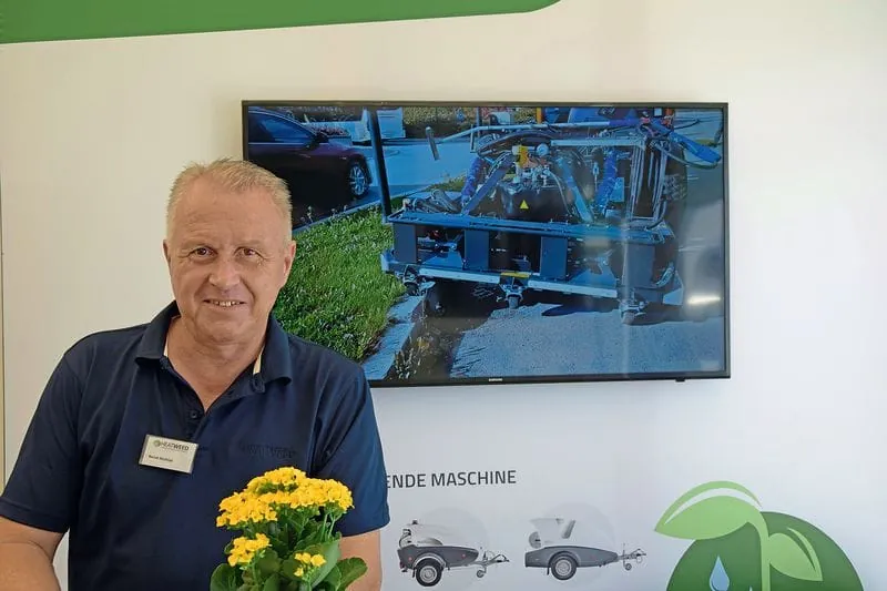 Sein Produktprogramm hat Stadiko um ein System zur Wildkrautbekämpfung mit Heißwasser erweitert. Die Maschine, die man wie einen kleinen Elektrostapler hinter sich herfahren lassen kann, hat einen flexibel montierten Flächenwagen an der Stirnseite. Dies macht den Ökotherm laut Anbieter zur kleinsten, komplett autarken Heißwasser-Wildkrautbekämpfung auf dem Markt. Anschaffungs- und Betriebskosten sind vergleichsweise gering, da kein zusätzliches Trägerfahrzeug benötigt wird. Der mit Batterie angetriebene Heizölbrenner hat eine Heizleistung von 90 Kilowatt. Ist der Tank mit 280 Litern Wasser gefüllt, ist die Maschine in weniger als drei Minuten auf Betriebstemperatur und einsatzbereit. Der 65 Zentimeter breite Flächenwagen kann seitlich so verschoben werden, dass er bis zu zehn Zentimeter über das Fahrgestell hinaus reicht. Bei der Wildkrautbekämpfung arbeitet der Ökotherm mit bis zu 130 Grad Celsius und verbraucht dabei etwa zehn Liter Wasser pro Minute. Ein Teil des Wassers wird zu Dampf, der die Flächen aufheizt. Das gleichzeitig ausgebrachte Wasser wird im Flächenwagen gleichmäßig verteilt. Dadurch entsteht auch in Hanglagen ein dünner Wasserfilm, der das Wildkraut verbrüht. Schwer zugängliche Stellen lassen sich mit dem 20 Meter langen, doppelwandigen Bewegungsschlauch und den entsprechenden Handlanzen oder Schiebewagen bearbeiten. Als Extra kommt eine Reinigungslanze hinzu, mit der beispielsweise Papierkörbe oder Parkbänke gereinigt und auch Aufkleber oder Kaugummi mit kochend heißem Wasser entfernt werden können.