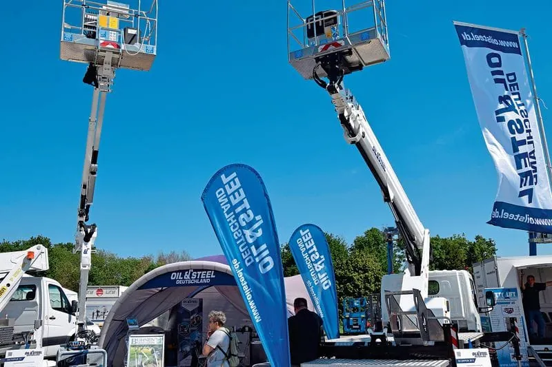 Bauscher, deutscher Generalimporteur für Oil&Steel-Arbeitsbühnen, präsentierte ein breites Programm. Die Serie Octopus zeichnet sich durch ihre Kompaktheit aus. Die Arbeitsbühnen der Baureihe Scorpion sind auf 3,5-Tonnen-Lkws aufgebaut. Die Teleskoparme haben eine maximale Arbeitshöhe von 23 Metern bei einer maximalen Reichweite von 13 Metern. Die Serie Snake umfasst Gelenkteleskop-Arbeitsbühnen auf Lkws von 3,5 bis 7,5 Tonnen. Der von Oil&Steel patentierte Pantograph ermöglicht das übergreifende Arbeiten und parallele Abfahren von Fassaden (Arbeitshöhe bis zu 27 Meter, seitliche Reichweite bis zu 14 Meter). (Bild 4)