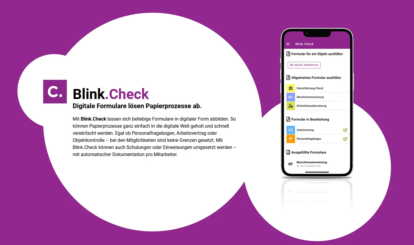 Mit Blink.Check lassen sich beliebige Formulare in digitaler Form abbilden. So können Papierprozesse ganz einfach in die digitale Welt geholt und schnell vereinfacht werden. Egal ob Personalfragebogen, Arbeitsvertrag oder Objektkontrolle – bei den Möglichkeiten sind keine Grenzen gesetzt. Mit Blink.Check können auch Schulungen oder Einweisungen umgesetzt werden – mit automatischer Dokumentation pro Mitarbeiter.