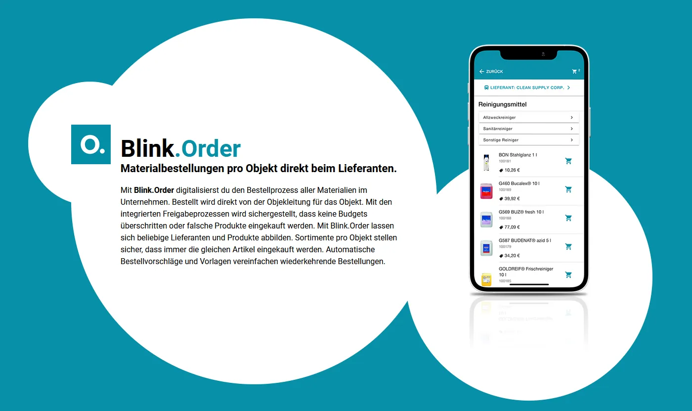 Mit Blink.Order digitalisierst du den Bestellprozess aller Materialien im Unternehmen. Bestellt wird direkt von der Objektleitung für das Objekt. Mit den integrierten Freigabeprozessen wird sichergestellt, dass keine Budgets überschritten oder falsche Produkte eingekauft werden. Mit Blink.Order lassen sich beliebige Lieferanten und Produkte abbilden. Sortimente pro Objekt stellen sicher, dass immer die gleichen Artikel eingekauft werden. Automatische Bestellvorschläge und Vorlagen vereinfachen wiederkehrende Bestellungen.