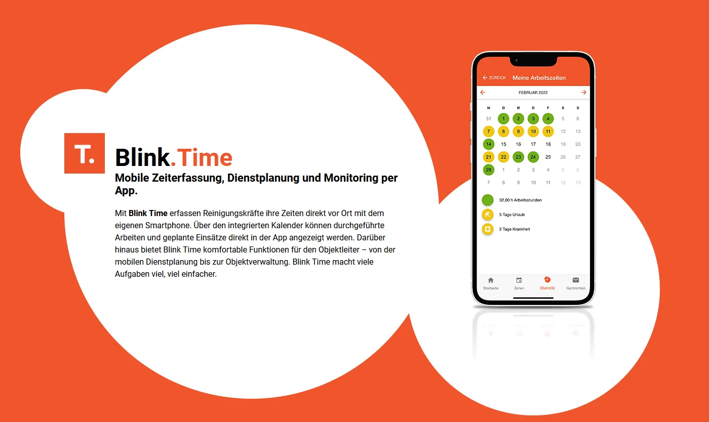 Mit Blink Time erfassen Reinigungskräfte ihre Zeiten direkt vor Ort mit dem eigenen Smartphone. Über den integrierten Kalender können durchgeführte Arbeiten und geplante Einsätze direkt in der App angezeigt werden. Darüber hinaus bietet Blink Time komfortable Funktionen für den Objektleiter – von der mobilen Dienstplanung bis zur Objektverwaltung. Blink Time macht viele Aufgaben viel, viel einfacher.