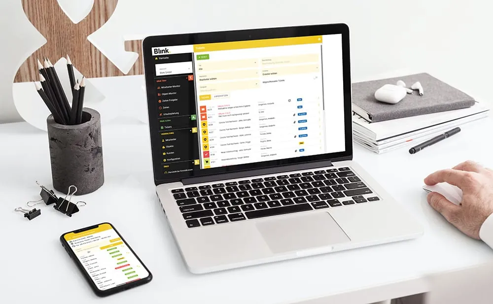Mit Blink.Active bekommt deine Gebäudereinigung ein zentrales Werkzeug für die Kommunikation und Aufgabenverwaltung. Der Chat ermöglicht die direkte Kommunikation mit den Reinigungskräften – und das DSGVO konform! Und mit den Tickets lassen sich beliebige Workflows digitalisieren und steuern.