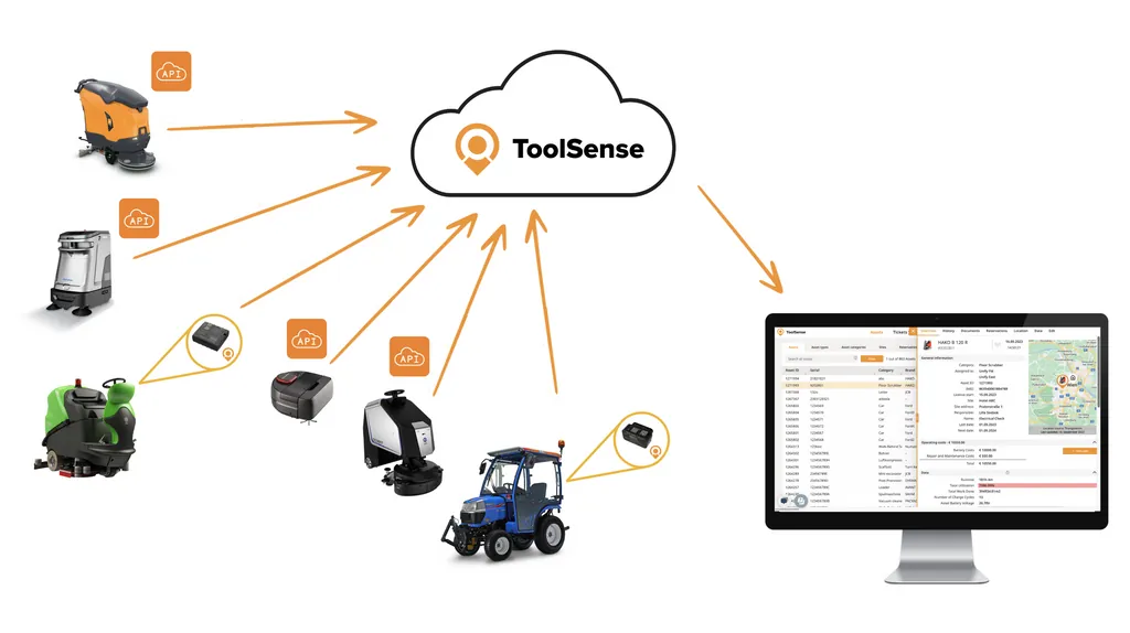 IoT-Integration: Echtzeitinformationen zu Standorten, Laufzeiten und Zuständen erhöhen die Transparenz. ToolSense integriert zudem OEM-Systeme wie Hako Fleet, Kärcher Equipment Management, Taski IntelliTrail, i-team i-link oder Numatic NuTrack.