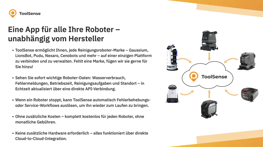 Roboter-Integrationen: ToolSense ist eine der weltweit führenden Plattformen für Robotermanagement im Facility Service. Cloud-to-Cloud Integrationen mit Herstellern wie LionsBot, Gausium, Nexaro, Kärcher, CenoBots, Tennant, Nilfisk, Taski und weiteren ermöglichen Echtzeitdaten wie Laufzeiten, Wasserverbrauch, Fehlercodes und Reinigungstasks. Ohne Zusatzhardware und ohne Kosten pro Roboter.
