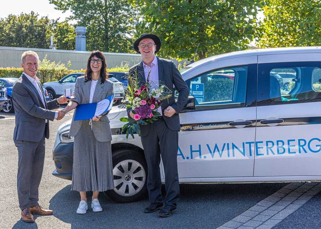 Andreas Ehmke, Präventionsleiter BG BAU, und sein Stellvertreter Udo Dudde überreichten die Auszeichnung an Jana Winterberg, seit 2009 alleinige Geschäftsführerin des Unternehmens, dessen Wurzeln bis ins Jahr 1870 zurückreichen. Sie nahm die Ehrung stellvertretend für ihre Mannschaft entgegen. "Es ist immer sehr schön, wenn das Engagement und die Ergebnisse, welche unser Unternehmen zeigt, zur Kenntnis genommen werden – auch wenn Arbeitsschutz und Gesundheitsschutz noch nicht den hohen Stellungswert in der Öffentlichkeit haben, den wir uns wünschen", sagte die Gebäudereinigermeisterin bei der Ehrung am Firmensitz in Wuppertal. 2009 war A.H. Winterberg bereits mit dem Deutschen Arbeitsschutzpreis ausgezeichnet worden.