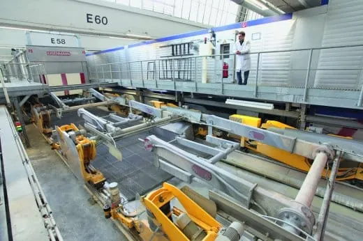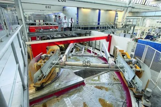 Man muss sich die Anlage wie ein enges Oval vorstellen mit zwei gegenläufigen Bahnen. Die Karosserien passieren auf sogenannten Shuttles befestigt insgesamt 14 hintereinanderliegende Becken, in die sie mittels Schwenk- und Drehbewegungen der Shuttles komplett eingetaucht werden. Die eine Bahn mit insgesamt zehn Becken dient der Vorbehandlung: Das Reinigen der Karosserie von den im Karosseriebau eingesetzten Korrosionsschutzölen und Ziehfetten erfolgt schwach alkalisch mit wässrigen Salzen, Netzmitteln und Emulgatoren.