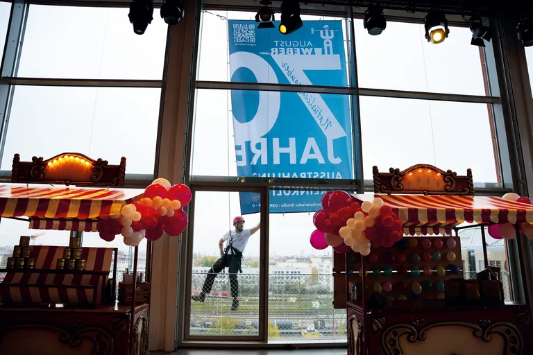 Spektakulärer Auftritt der Fassadenkletterer von August Weber: Bei der Feier zum 70-jährigen Bestehen platzierten sie ein Großplakat am Ort des Geschehens in Werk3. - © August Weber