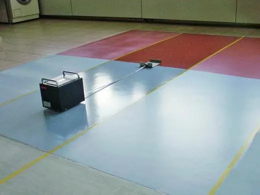 Um die Trittsicherheit eines Fußbodens auch im Betriebszustand bestimmen und überprüfen zu können, wurde ein ortsunabhängig einsetzbares Messverfahren entwickelt und im Normentwurf E DIN 51131** beschrieben. Im Rahmen dieses Bestimmungsverfahrens wird die Reibung zwischen der Fußbodenoberfläche und einem sich selbsttätig auf ihm bewegenden Messgerät (GMG 100) gemessen und als Ergebnis der Gleitreibungskoeffizient µ ermittelt. Die Kontaktstelle zwischen Bodenbelag und Messgerät kann wahlweise aus Gummi, PVC oder Leder bestehen, so dass alle gängigen Schuhsohlenmaterialien auf einem Bodenbelag getestet werden können.