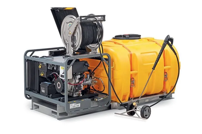 Verschmutzungen und Unkraut muss man möglichst sofort bekämpfen, denn erfahrungsgemäß kommt zu abgelagertem Dreck recht schnell weiterer hinzu und Unkraut breitet sich aus. Für eine schnelle und effiziente Reinigung hat Cemo das mobile System MCS 1000 HD auf Heißwasserbasis entwickelt. Aufgebaut auf einer stabilen Kufenplattform mit Staplertaschen vorn und seitlich, besteht es aus einem Wasservorratstank und einem autarken, mit Heizöl beziehungsweise Diesel betriebenen Kärcher-Hochdruckmodul. Das Modul erzeugt einen bis zu 98 Grad Celsius heißen Hochdruckwasserstrahl – wahlweise für eine Hochdrucklanze mit Pistolengriff oder eine flächige Unkrautlanze – mit 40 bis 200 bar Druck bei einer Fördermenge von 450 bis 900 Litern pro Stunde. Das PE-Wasserfass gibt es in den Varianten wahlweise 600, 1000 oder 2000 Litern Inhalt. Der Brennstoffverbrauch der Reinigungseinheit ist mit 5,6 Litern pro Stunde angegeben. Der Standardhochdruckschlauch misst zehn Meter; optional ist eine Schlauchtrommel mit 20 oder 40 Metern Hochdruckschlauch erhältlich.