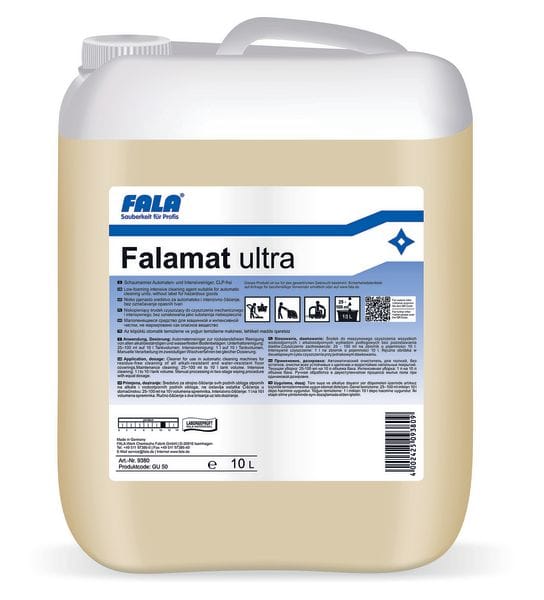 Falamat ultra lässt sich sehr variabel dosieren. So kann eine ­geringe und sparsame Dosierung in der Unterhaltsreinigung mit dem Scheuersaugautomaten oder eine konzentrierte Intensiv­reinigung mit der Einscheibenmaschine – bis hin zur gezielten Entfernung von diversen Abriebspuren – flexibel eingestellt werden. Trotz der hohen Reinigungsleistung ist bei Falamat ultra ­keine Gefahrstoff-Kennzeichnung nach der CLP-Verordnung erforderlich. Die dezente Beduftung des Reinigers macht die Verarbeitung angenehm und reduziert die Belastung durch starke ­chemische Gerüche.