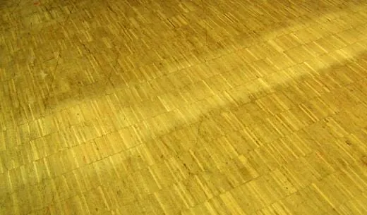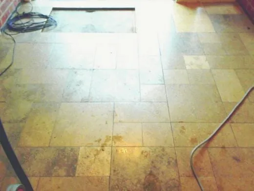 Wichtig war den Betreibern der große Saal mit ca. 120 m² Hochkantlamellenparkett. Es war grau, verkratzt, gefleckt und zeigte an den Rändern Wachsaufbau. Doch die Lehrer plagte ein anderes Problem: 21 Schüler, die in acht Schulstunden alle gleichmäßig beschäftigt werden müssen, dabei einen Lernerfolg haben sollten und ein repräsentatives Ergebnis hinterlassen wollen. Das war in einem einzigen Saal kaum möglich. Aber aufgeben und Pfarrer Weißenborn und Frieder Nuber enttäuschen, das wollten Durmishi und Liersch auf keinen Fall. Deshalb fotografierten und besichtigten sie auch die anderen Räume, die Großküche mit Sicherheitsfliesen, die Personalräume und Büros ebenfalls mit Hochkantlamellenparkett, die Toilettenanlagen mit Feinsteinzeugfliesen aus den 60er Jahren, verkalkte Sanitärkeramik sowie ein reinigungstechnisches Highlight: einen verkratzten, stumpfen Juraplattenboden im Eingangsbereich. Für die Lehrer war klar, sie werden nicht nur das Parkett, sondern auch den Juraboden im Eingang und die Sanitärräume auf Vordermann bringen. Die Küche musste zumindest vorerst außer Acht gelassen werden.