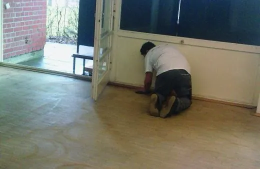 Die Kristallisationsgruppe hat einen schlechten Standort: alle stapfen durch den etwa 20 m² großen Eingangsbereich. „Wenigstens die Holzwürmer sollen über die Terrasse gehen“, fordern Vorarbeiter Johannes Sahic und Michaela Keidler. Ihr dritter Mann, Richard Seeg, ist krank. Die zwei müssen die Arbeit allein bewältigen. Auch sie weichen von ihrem geplanten Arbeitsablauf ab. Nach der Grundreinigung stellten sie Kanten und Kratzer fest und entschlossen sich, trotz der Unterbesetzung zu einem zusätzlichen Schleifgang. Gegen 10 Uhr kommt Pfarrer Weißenborn, diesmal mit Getränken und belegten Brötchen zum 2. Frühstück. „Wer so fest arbeitet, braucht auch etwas in den Magen“, weiß er.