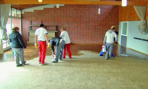 Parkett schleifen, Steinkristallisation und Grundreinigen von sanitären Anlagen: Auszubildende im 3. Lehrjahr der Gewerblichen Schule Metzingen haben im evangelischen Ferientagheim der Gemeinde an nur einem Tag ein kleines Wunder bewirkt.