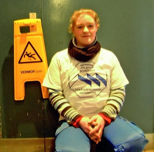 Gleich nebenan regiert Vorarbeiterin Sandy Haas. Sie sorgt in der Damentoilettenanlage mit Patricia Spahn, Bianca Kleiböhmer und Steffen Ziegler für Glanz und Perfektion. „Schauen Sie, Frau Liersch“, beschwert sie sich, „da haben die Kinder Lackfarbe im Waschbecken ausgeleert. Ich habe kein organisches Lösungsmittel zur Lackentfernung dabei!“ Wie soll man denn darauf kommen, dass Lackflecken im Waschbecken sind? Probleme wie im richtigen Leben doch die Schule ist nicht weit weg. Es kann reagiert werden. So lernen die Azubis, in solchen Situationen das nächste Mal bei der Vorbereitung an das Unmögliche zu denken.