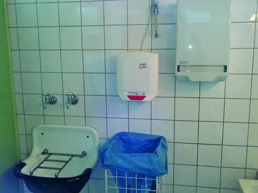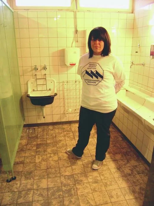 Stefan, der Holzvorarbeiter, betreut seine Truppe umsichtig und souverän. Der Boden liegt nach den diversen Schleifgängen mit Schleifgitter und Legno-Pad blank und staubfrei vor und kann nun mit „Parketta“ (Kiehl) gewachst werden. „Wir müssen Gas geben, dass wir das Einwachsen noch vor der Mittagspause schaffen, während wir essen, kann das Wachs trocknen und wir können danach polieren“, motiviert er die Gruppe. Auch die Sanitärleute sind fertig. Alles blinkt. Sandy ist stolz auf ihre sauberen Waschbecken, die bereit sind für die Beschichtung. Burak kämpft in der Männertoilette mit starken Kalkablagerungen. Metzingen liegt am Fuße der Schwäbischen Alb, bei einer Wasserhärte von rund 21 dH kann sich der Fachmann den Aufbau dieser Ablagerung vorstellen. So wie Burak, Nadir und Sven stellen auch Steffen, Patricia und Sandy fest, dass nach dem Auftragen der „easy-to-clean“-Beschichtung auf den grundgereinigten Sanitärkeramiken das Wasser wunderschön abperlt. Die nach dem Trocknen entstehenden „Wasserflecken“ können locker mit einem feuchten Raumpflegetuch abgewischt werden.