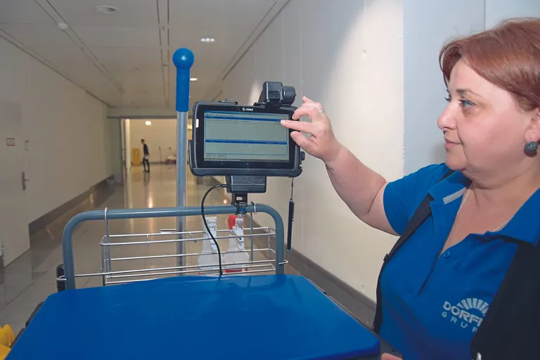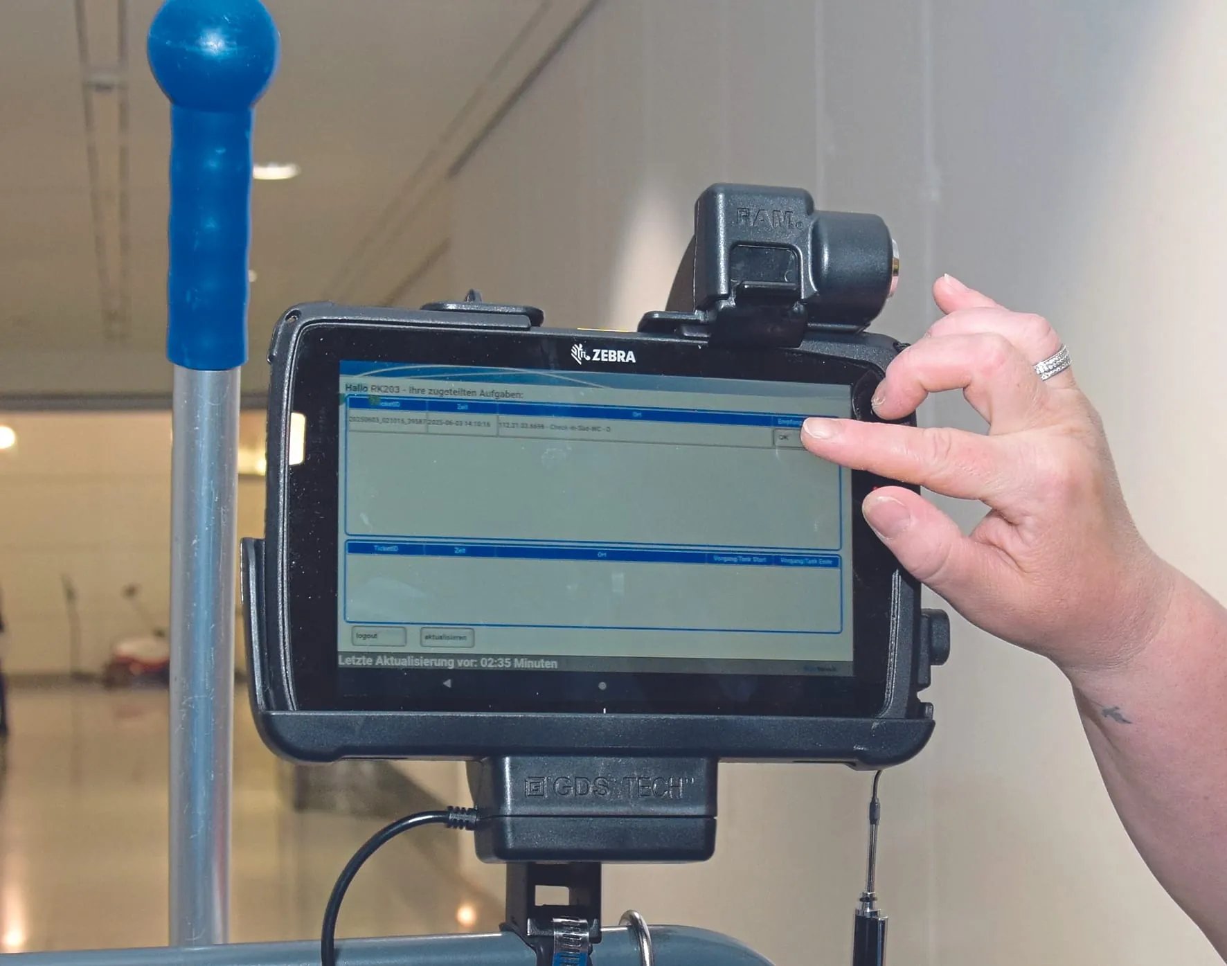 In welcher WC-Anlage besteht Handlungsbedarf? Nino Mgebrishwili, Reinigungskraft bei Dorfner am Flughafen München, kann ihren nächsten Einsatz­ort mit allen zugeteilten Aufgaben jetzt am Tablet abrufen. Das Gerät ist diebstahlsicher auf dem Reinigungswagen befestigt.
