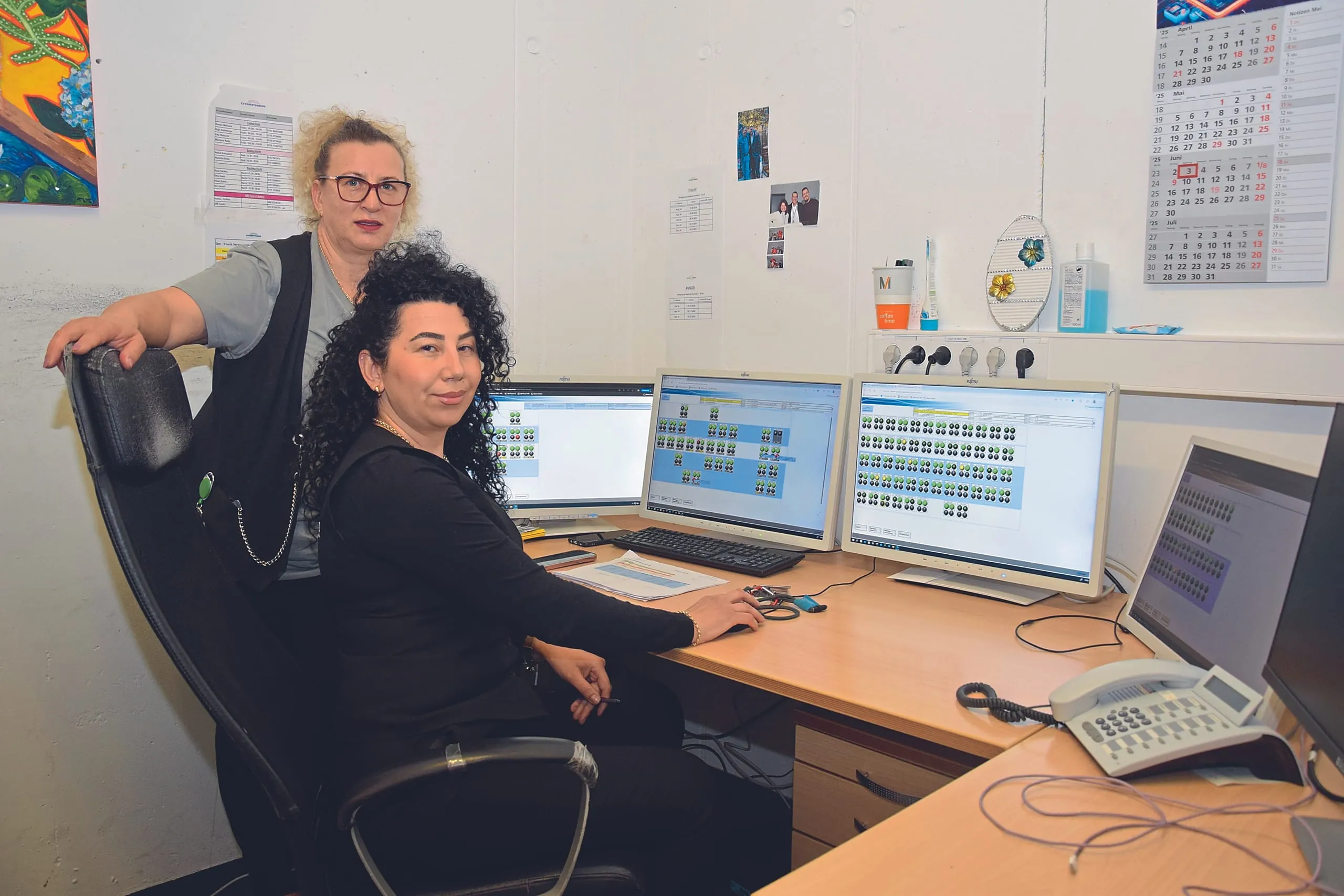 Koordiniert werden die Reinigungseinsätze in der Leitstelle von Dorfner am Flughafen München – hier zu sehen: Renate Nicolaus (li.) und Liridona Murati. Die­ ­benötigten Daten und Informationen liefert das QM-Touch-System. ­Dazu gehört auch die Zahl der Sanitärraumnutzer, die ­mithilfe von Sensoren am Eingang jeder WC-Anlage ermittelt wird.