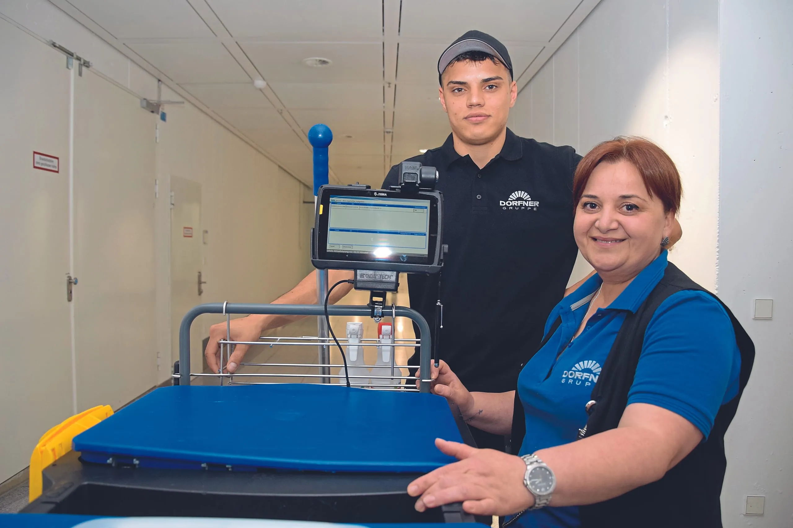 Insgesamt 24 Reinigungswagen für die Arbeit in Terminal 2 sind bislang mit Tablets ausgerüstet und so mit dem System verbunden. Hier zu sehen: Altin Haxholli, technischer Assistent bei Dorfner am Flughafen, mit Nino Mgebrishwili.