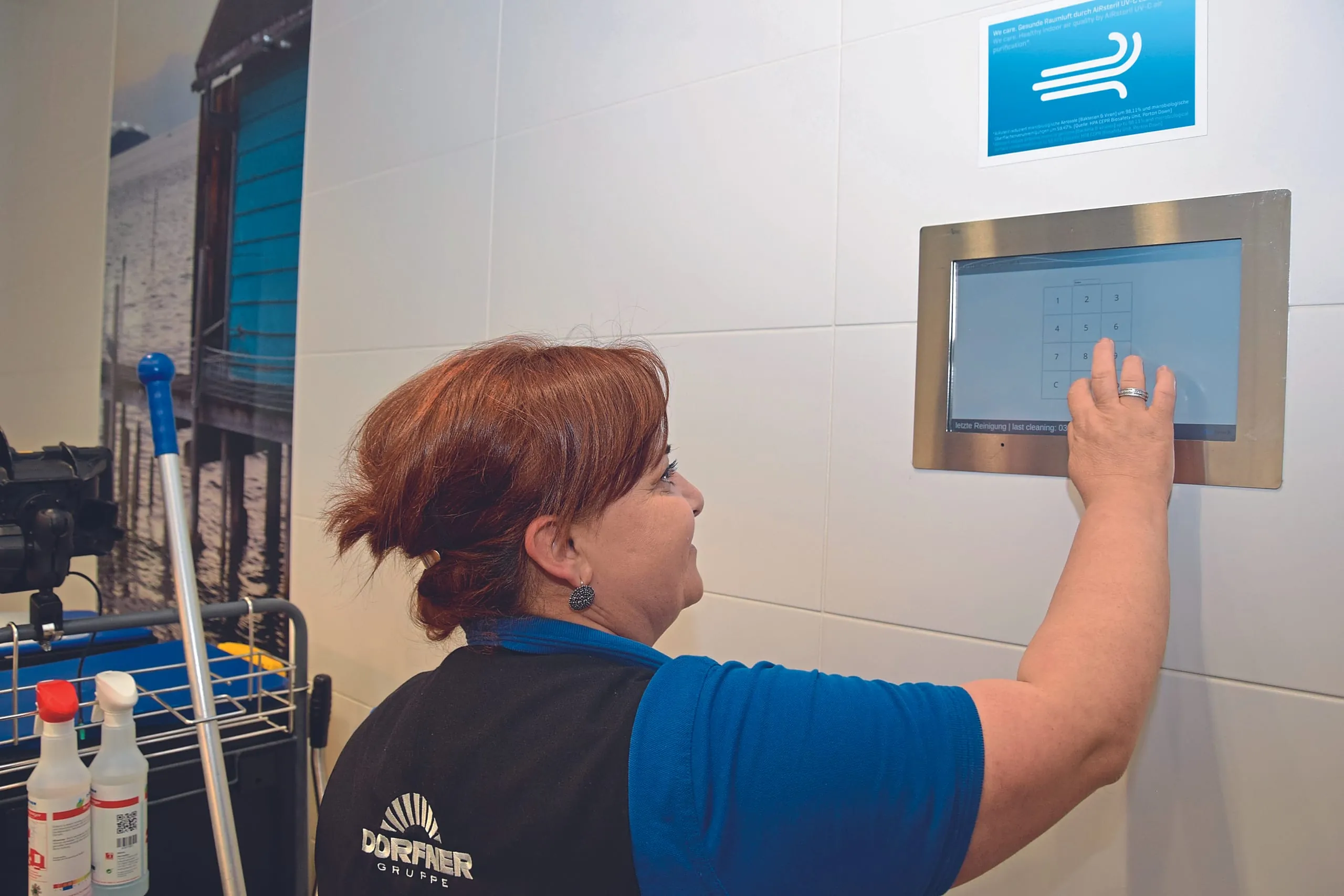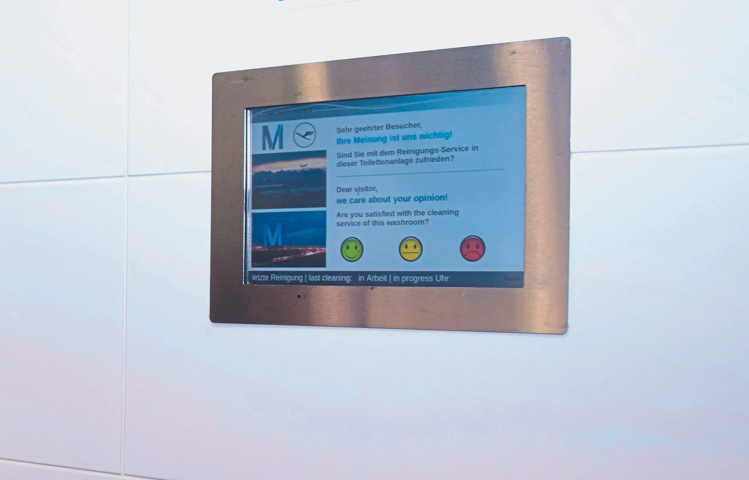 Ein weiterer Baustein des Systems: In den Sanitärräumen sind fest eingebaute Monitore zu finden. Durch Berühren entsprechender Symbole auf dem Display können Nutzer den Zustand der WC-Anlage bewerten und gegebenenfalls Mängel melden.