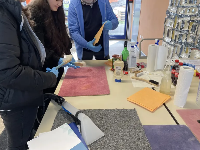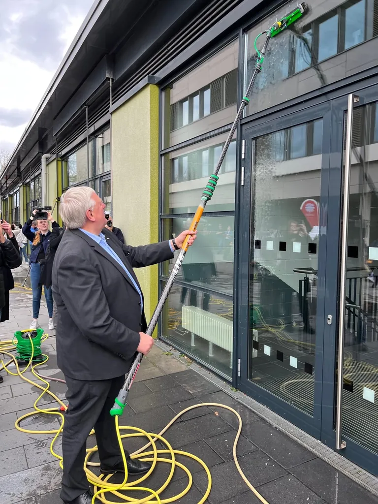 Hoch hinaus ging es aber auch bei den Gebäudereinigern. So fuhren die Jugendlichen im Außenbereich mit einem Hubsteiger 30 m nach oben und informierten sich dabei über Fassadenreinigung. Ebenfalls draußen konnten sie sich davon überzeugen, wie fortschrittlich – und sauber – die Reinigung von Glasflächen im Osmose-Verfahren ist. Im Innenbereich der Messe bestand schließlich die Möglichkeit, sich an Aufgaben wie der Hartbodenreinigung mit einer Exzenter- und einer 2-Scheiben-Maschine, der Teppichreinigung oder auch dem Säubern von Polstermöbeln mit einem Rucksackstaubsauger zu versuchen.