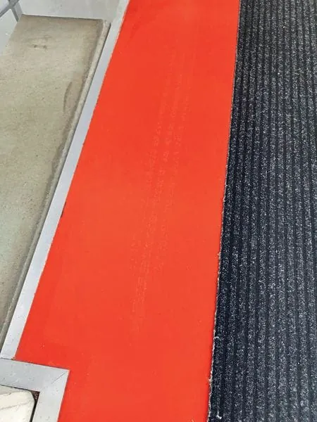 Hierbei stellte der Sachverständige jedoch fest, dass die verwendeten Gummigleiter derart abrasiv auf die Oberfläche wirkten, dass zum einen die Gummigleiter mit der roten Farbe des Bodens komplett belegt waren, zum anderen hinterließ das Gleitreibungsmessgerät deutliche Spuren auf der Oberfläche des Bodens.
