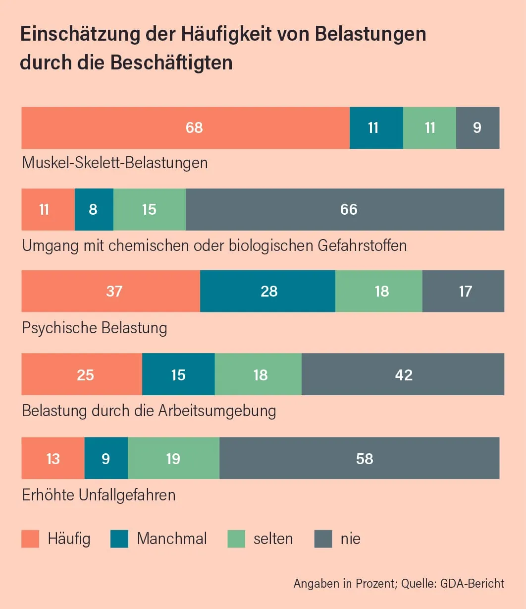 Von den Beschäftigten selbst wurden auf die Frage nach der Häufigkeit von Belastungen vor allem Muskel-Skelett-Belastungen (bei 80 Prozent häufig oder manchmal vorkommend) und psychische Belastung (65 Prozent) genannt. Belastungen durch die Arbeitsumgebung kommen bei 40 Prozent, erhöhte Unfallgefahren bei 22 Prozent und eine Gefährdung durch den Umgang mit chemischen und biologischen Gefahrstoffen bei 19 Prozent der Beschäftigten häufig oder manchmal vor (siehe Grafik).