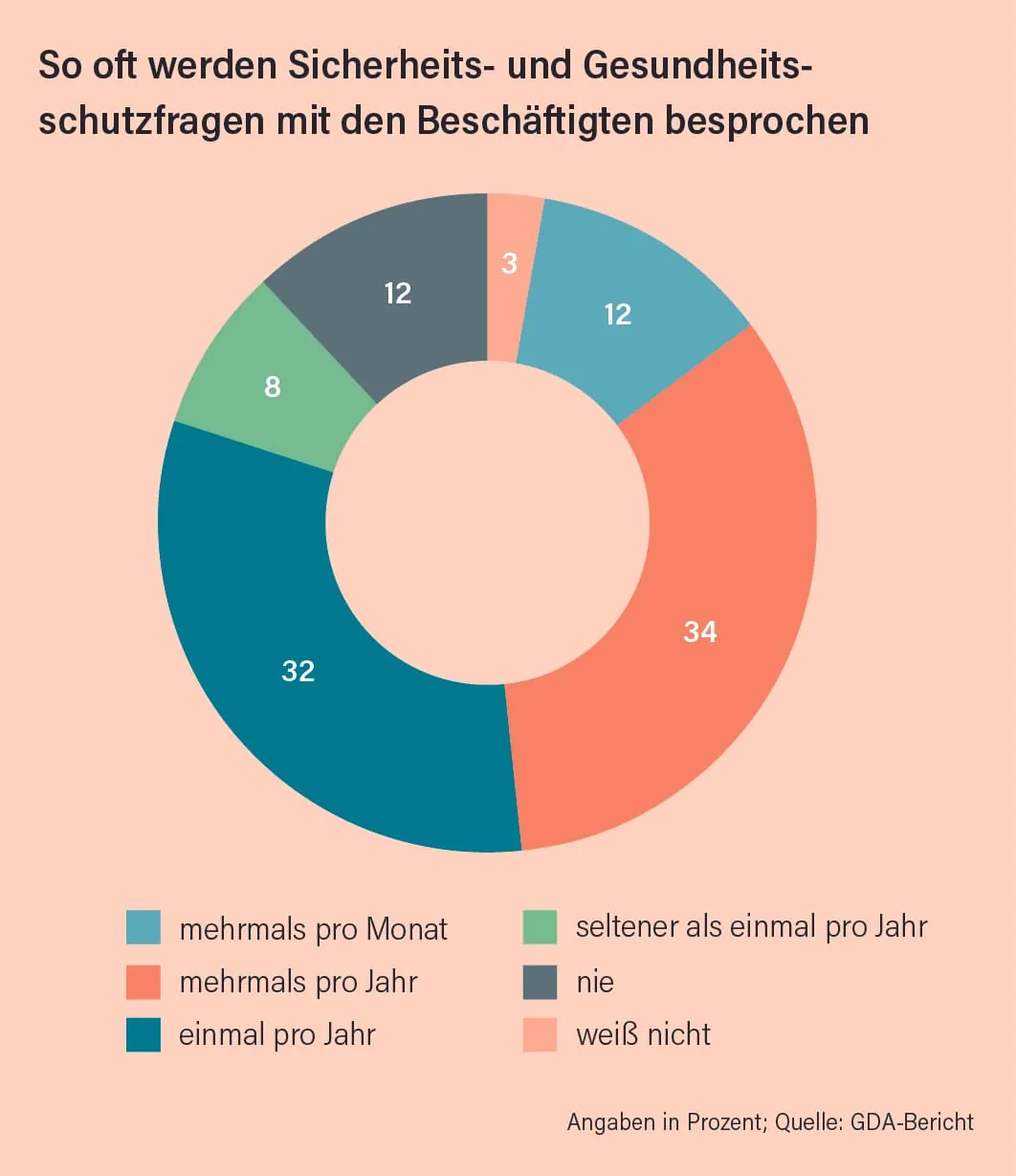 Knapp die Hälfte der Beschäftigten gab an, dass Sicherheits- und Gesundheitsschutzfragen mehrmals pro Jahr (34 Prozent) oder sogar mehrmals pro Monat (zwölf Prozent) thematisiert wurden. 52 Prozent berichteten hingegen, dass Arbeitsschutzfragen in Abteilungsbesprechungen nur einmal im Jahr oder seltener thematisiert wurden. Mehr als einer von zehn Befragten (zwölf Prozent) räumte ein, dass diese Themen nie zur Sprache kamen (siehe Grafik).