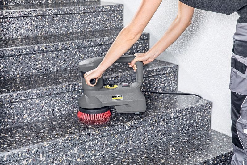 Fensterbänke, Treppen, schwer zugängliche Passagen in Sanitäranlagen & Co.: Es gibt viele Stellen, wo klassische Bodenreinigungsmaschinen aufgrund ihrer Größe nicht die passende Lösung sind. Hier setzt Kärcher mit der Mini-Scheuermaschine BD 17/5 C an: Als handgeführte Bürste mit Motor ermöglicht sie bei einem Gewicht von weniger als fünf Kilogramm und einer Arbeitsbreite von 170/200 Millimeter ein ergonomisches Reinigen und Polieren auch in Ecken und auf vertikalen Flächen. Soll eine Bürste gewechselt werden, wird dafür kein Werkzeug benötigt. Um verschiedene Einsatzmöglichkeiten in einem Gerät zu vereinen, verfügt die Mini-Scheuermaschine über eine regulierbare Drehzahl (maximal 450 Umdrehungen je Minute). Neben klassischem Schrubben für die Unterhaltsreinigung lassen sich mit den passenden Diamantpads Oberflächen auch kristallisieren und polieren. Für die Reinigung von Ecken ist optional eine Bürste erhältlich, die durch ihre abgerundete Form dafür besonders geeignet ist.