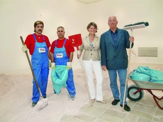 Der schweißtreibende Einsatz hat einen guten Grund. Filigranste Sägemehl-, Gips- und Pulverpartikel hinterlassen in den Ausstellungsräumen ihre sichtbaren und unsichtbaren Spuren - ob an den Wänden, an Leisten, auf Böden, in Belüftungsschlitzen oder auf den Fensterscheiben. Insgesamt vier Tage lang wird unermüdlich gekehrt, gesaugt und immer wieder gewischt. Einscheibenmaschine, Wassersauger und Staubsauger stehen nie still. Immer wieder müssen aufgrund der baulichen Gegebenheiten die fahrbaren Gerüste neu aufgebaut werden, damit die Fachkräfte auch an den Decken und Oberlichtern arbeiten können.