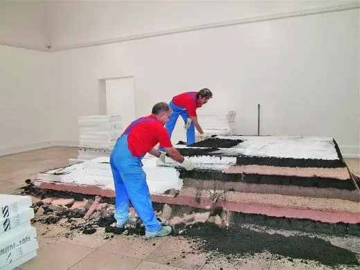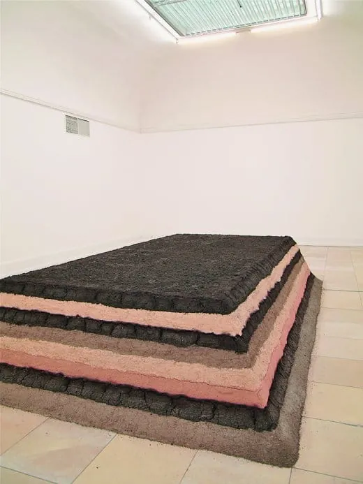 - „Es ist ein aufregender Moment für uns“, sagt Ellen Seifermann, Leiterin der Kunsthalle Nürnberg, „denn eine derartige Demontage von Kunstobjekten haben wir noch nie durchgeführt.“ Zum Beispiel eine trapezförmige Pyramide, die auf einer Kantenlänge von etwa 3 bis 5 m mit Erde beschichtet ist; darunter verbirgt sich ein Kern aus Styroporplatten. Ein anderer Raum der Kunsthalle Nürnberg ist wie in rosa Licht getaucht. Fast hüfthoch türmen sich darin Berge aus feinstem rosafarbenem Gipspulver. Es staubt, die Luft ist trocken, und die winzigen Partikel finden ihren Weg überall hin. Sie haften an den hohen schneeweißen Wänden der 1912 errichteten Kunsthalle, setzen sich in Bodenfugen fest und schwirren in die Belüftungsschächte. Gleich daneben liegt Rollrasen, mittlerweile eingetrocknet und spröde.