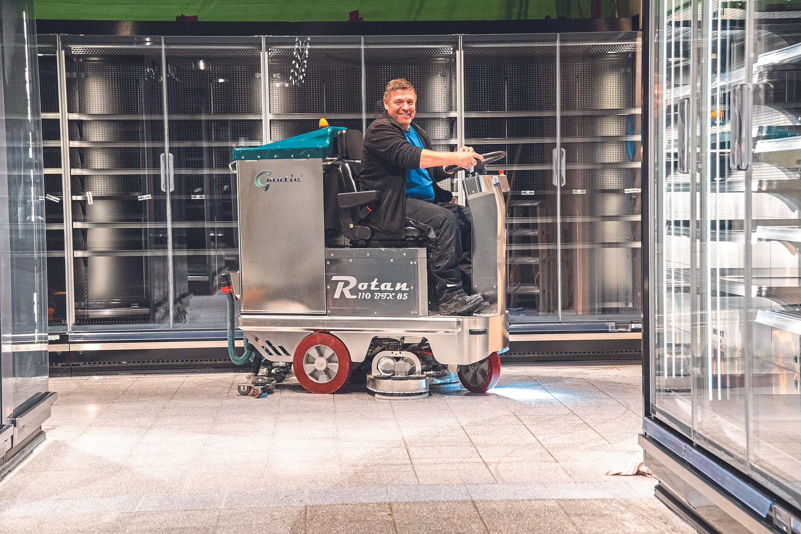"Wir hatten diese Aufgaben im Objekt bereits mit einer Reinigungsmaschine begonnen, aber es hat schlichtweg nicht funktioniert", berichtet Kille Krumbach. "Es fehlte an Anpressdruck und Umdrehungsgeschwindigkeit der Padscheiben. Ferner mussten wir häufig eine Pause einlegen, weil ein Überlastschutz die Maschine außer Betrieb setzte." Da Kille Krumbach gute Erfahrungen mit dem Aufsitzscheuersaugautomaten Rotan von Dr. Gansow Gmatic aus Bergkamen in einem anderen Objekt gemacht hatte,"lag die Entscheidung für uns auf der Hand: Auch hier musste dieser Maschinentyp zum Einsatz kommen".