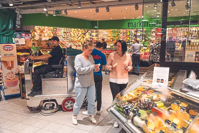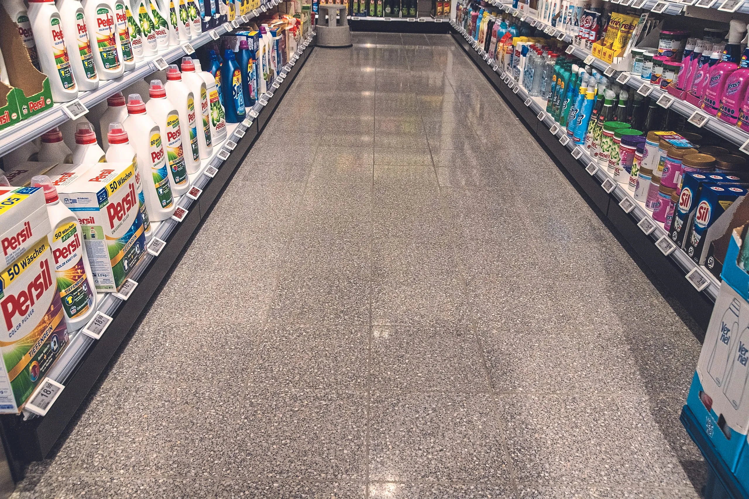 In einem Supermarkt sollte der Betonwerkstein-Fußboden erneuert werden. Die Sanierung hätte nur bei einer mehrwöchigen Schließung des Marktes umgesetzt werden können. Auf Empfehlung des Gebäudedienstleisters konnte diese zeit- und kostenintensive Maßnahme vermieden werden: Der Boden wurde stattdessen im Rahmen einer Sanierungsreinigung mit einer Scheuersaugmaschine und entsprechenden Pads in vier Schleifstufen auf einen Glanzwert von 60 aufgearbeitet.