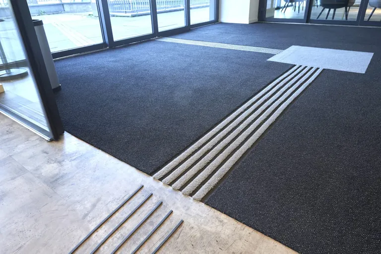 Die ausgezeichnete Sauberlaufzone sorgt für eine sichere Wegführung von Blinden und Sehbehinderten im Gebäudeinneren, darüber hinaus lässt sich eine zuverlässige Weiterführung bereits vorhandener Bodenleitsysteme – etwa in Form einer Überleitung vom Gehweg ins Gebäude – realisieren. Für eine optimale Berücksichtigung objektspezifischer Anforderungen kann das taktile Leitsystem zudem höchst variabel in die maximal 300 × 500 Zentimeter große Teppichmatte integriert werden. /mjt