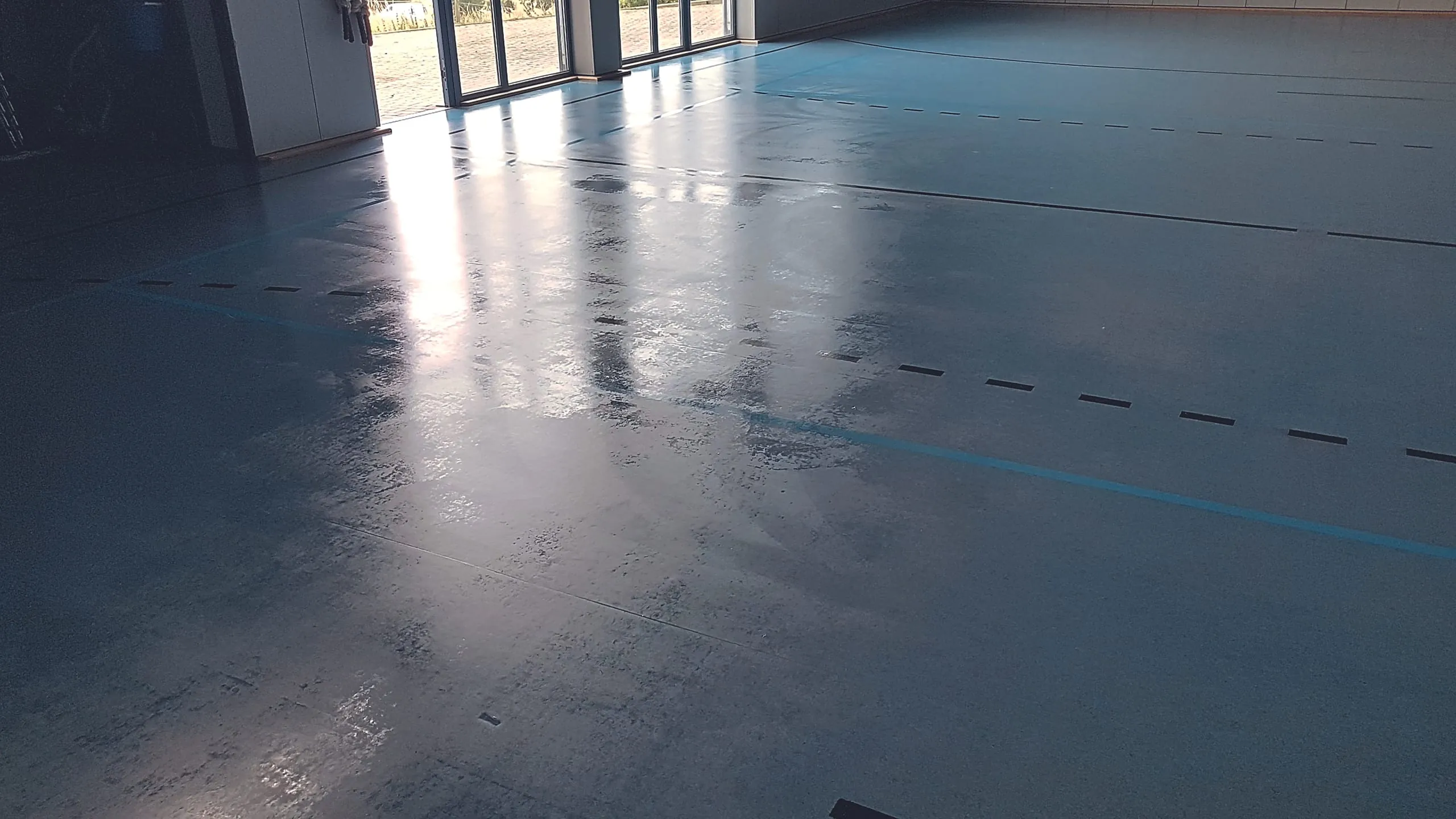 Auch Linoleumbeläge – hier zu sehen ein eingepflegter Linoleumbelag mit teilweise entfernter Vergütung – sind im Gesundheitswesen geeignet, allerdings eher für Bereiche, in denen keine hohe mechanische Belastung zu erwarten ist.