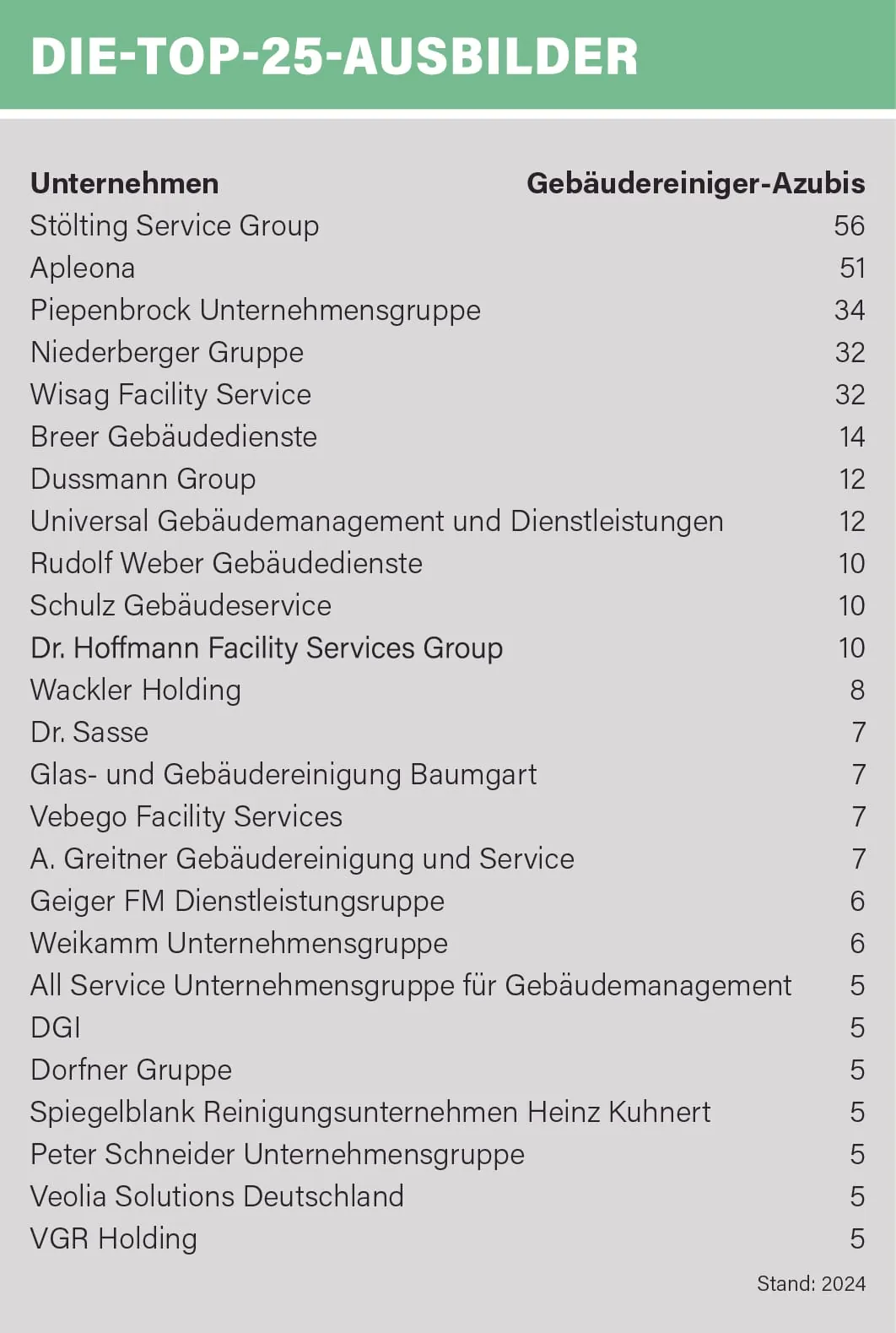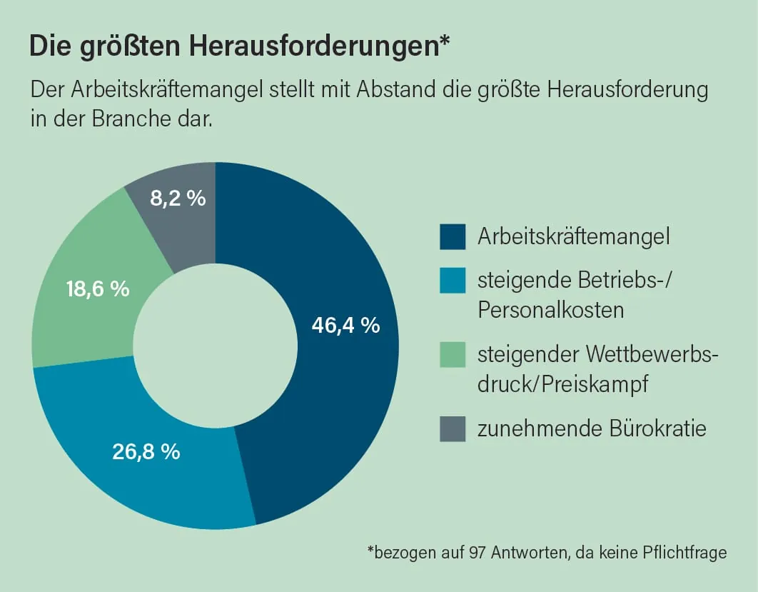 Die Tatsache, dass das marginale Plus bei den Beschäftigten bei Weitem nicht mit dem Umsatzwachstum Schritt halten kann, heißt nichts anderes als: Die Dienstleister müssen ihre Leistung mit immer weniger Reinigungskräften erbringen. Zwar ist der Arbeitskräftemangel in der Branche nicht neu, die Lage wird jedoch zunehmend brisanter. Gleiches gilt für die Entwicklung bei den Azubi-Zahlen. In Summe bildeten die 100 befragten Betriebe im vergangenen Jahr lediglich 424 Gebäudereinigerinnen und Gebäudereiniger aus. Zum Vergleich: Bei der letztjährigen Befragung meldeten die 98 Teilnehmer immerhin insgesamt noch 482 Gebäudereiniger-Azubis.